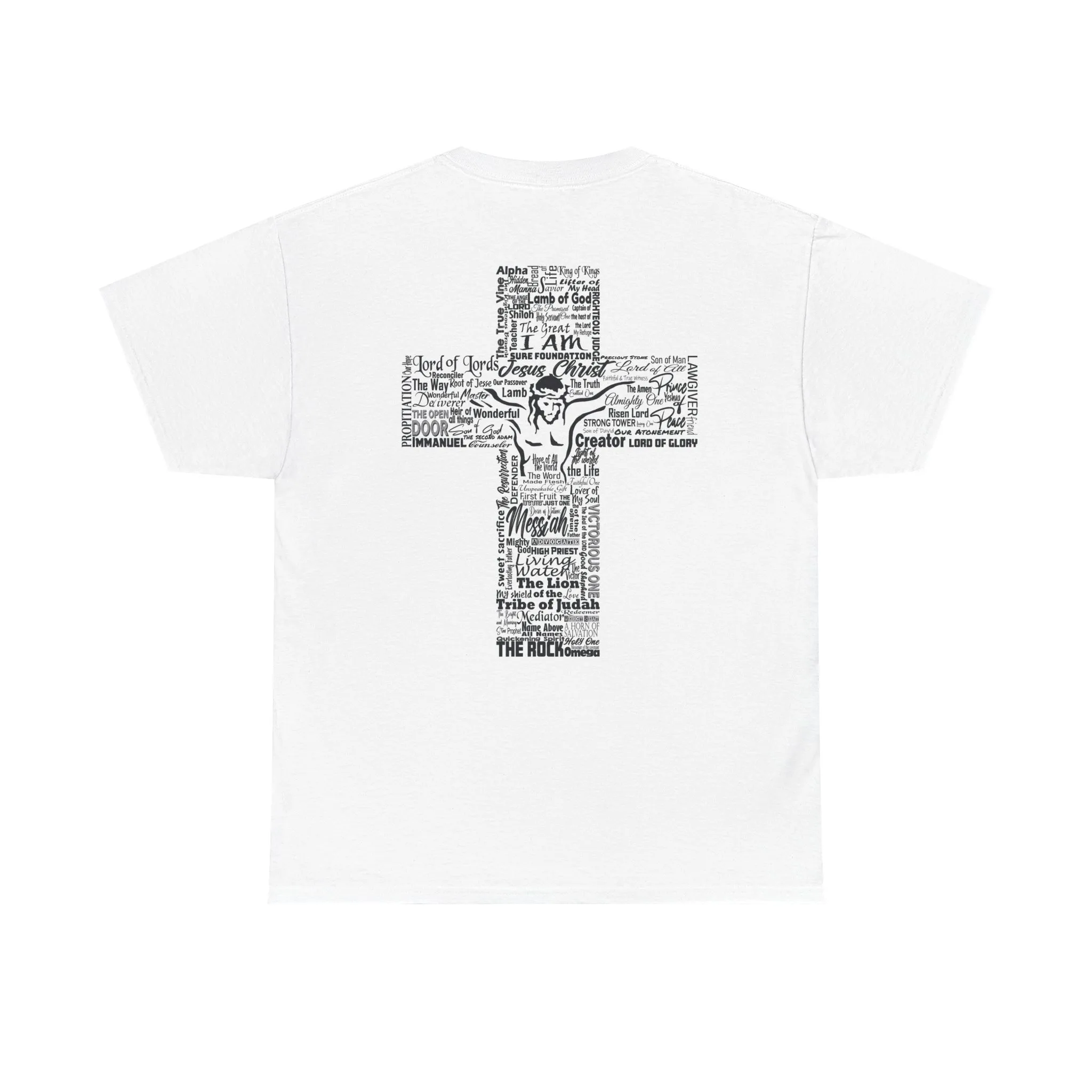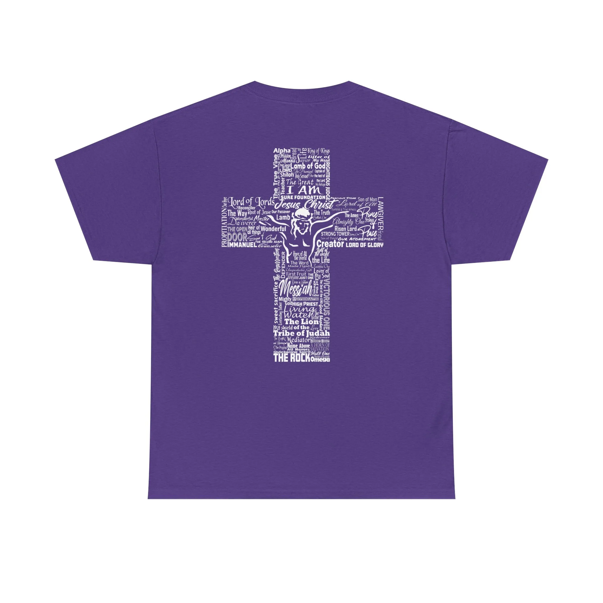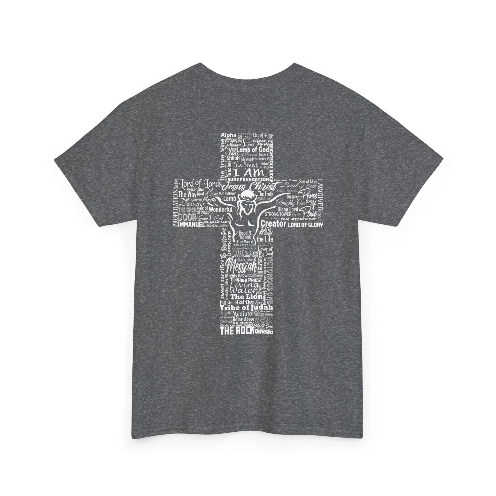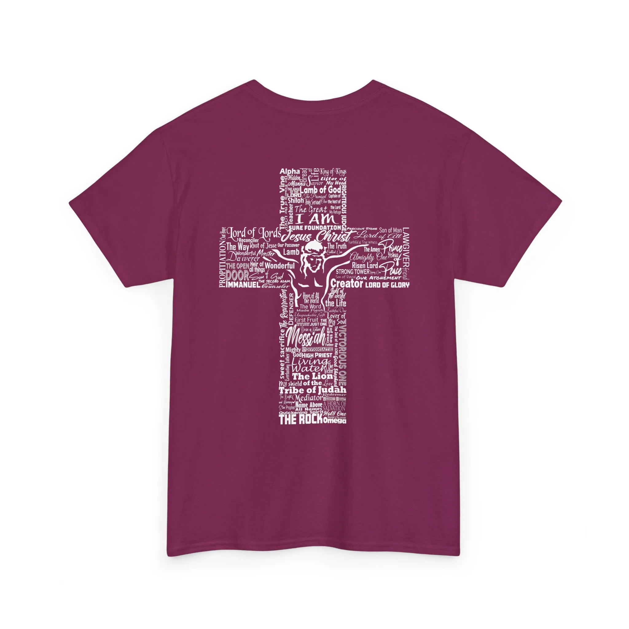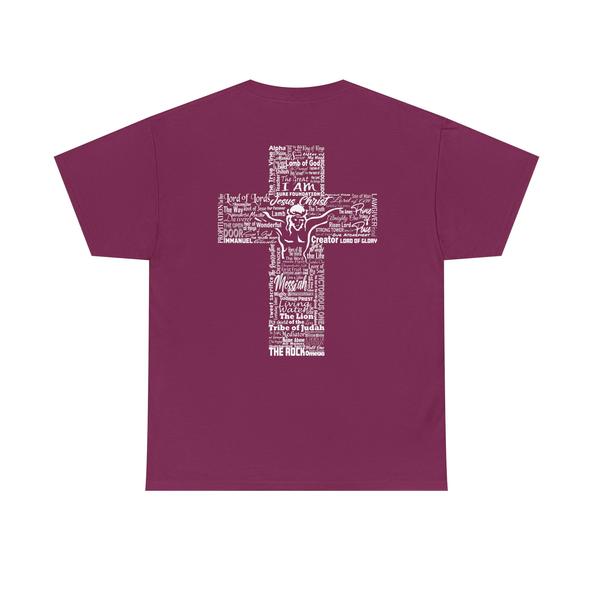 A Christ-themed tee featuring the names of Jesus in a cross word art design. This tee is perfect for those looking to tell the world that Jesus was more than a good person, that He is the fulfillment of the promised Messiah of the world.